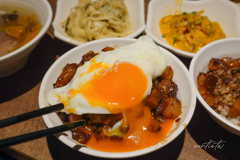 加了半熟蛋的魯肉飯吃起來更沒味道,蛋汁攪拌一下滷汁味道更淡。