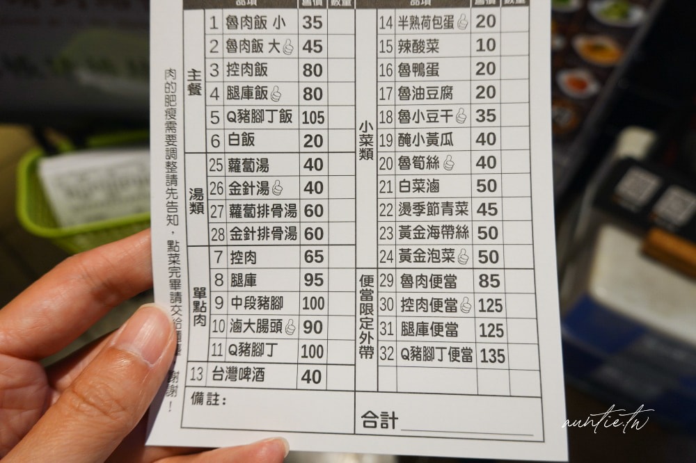主餐有魯肉飯、控肉飯、腿庫飯,想要單點控肉或腿庫也可以,另外小菜選擇也很多,價格上單價不高,但是份量有點少。