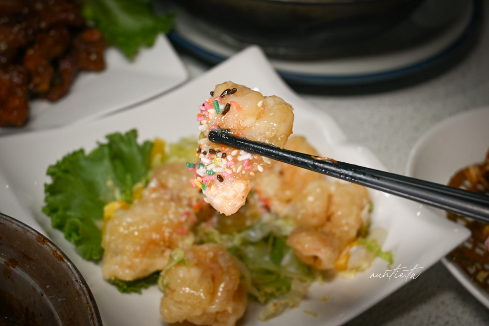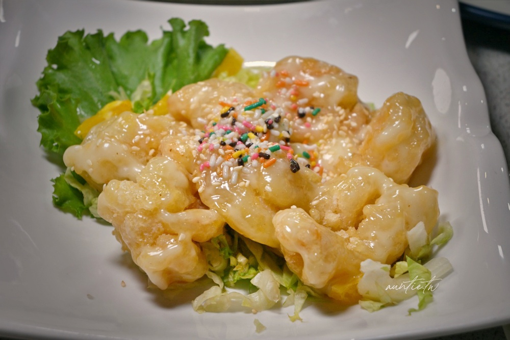 吃起來有酸甜的水果香氣,大顆飽滿的酥炸蝦球,裹滿了甜甜美乃滋,口感彈牙脆口,是大人小孩一定都會愛死的一道菜。