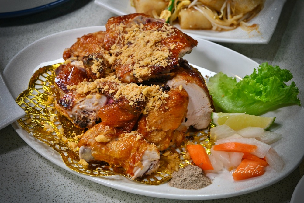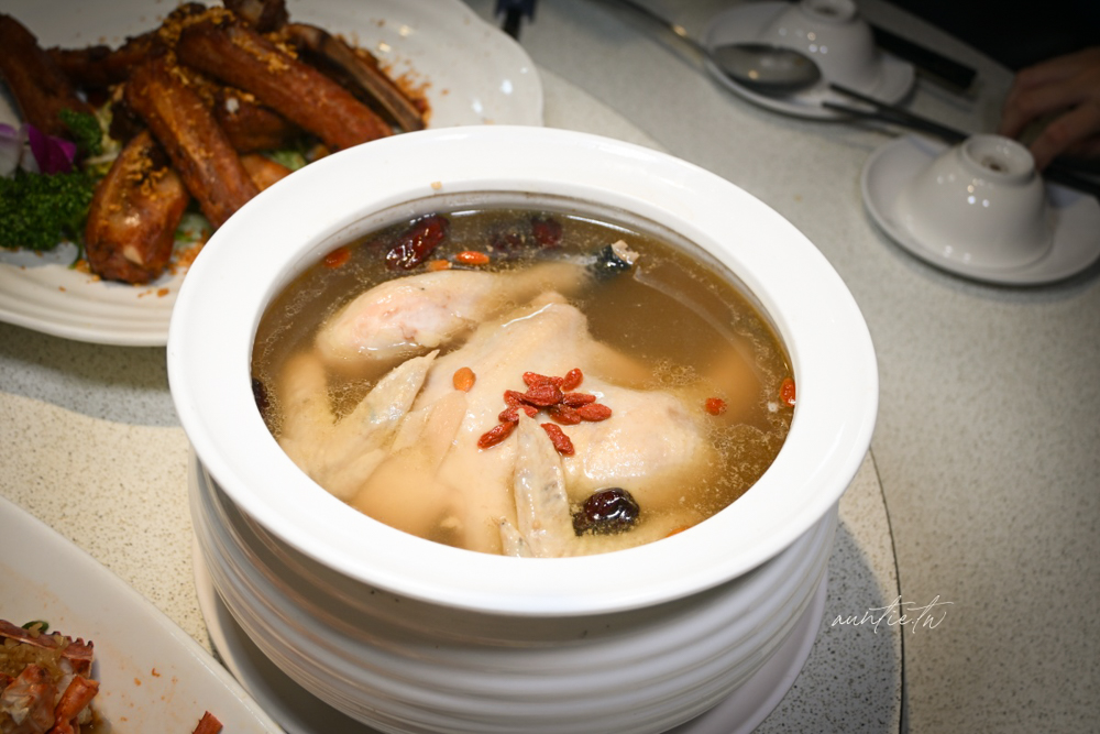 湯頭清澈呈現金黃色的雞湯盅,湯頭非常清爽甘甜而且不會油膩,整隻雞輕輕用湯匙一撥就骨肉分離。