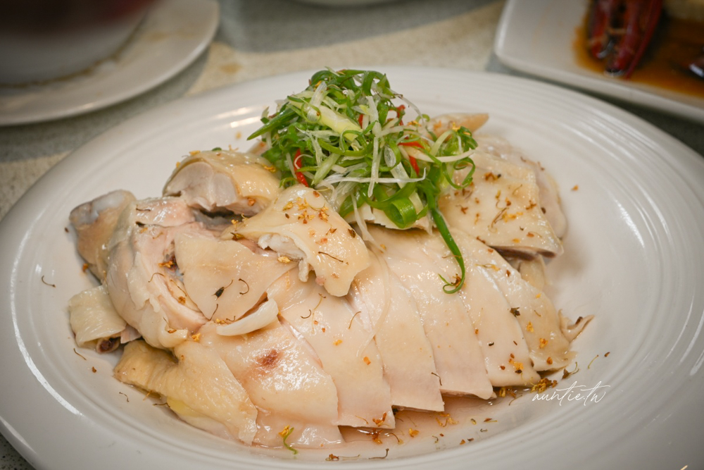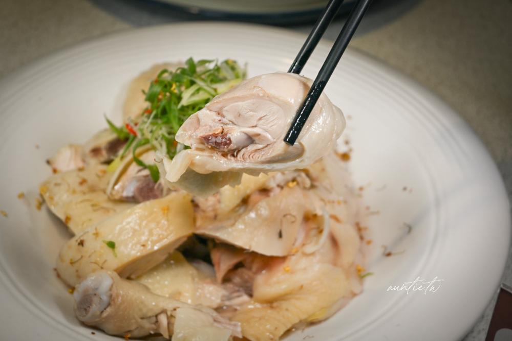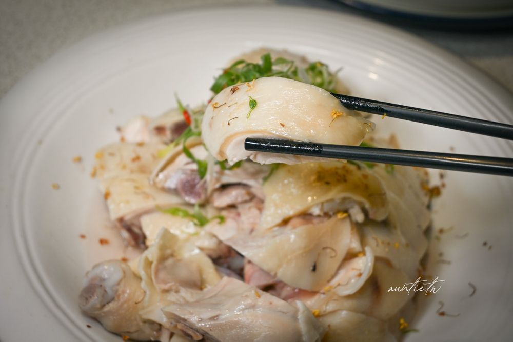 這道是冷盤料理,整體看起來晶瑩透亮,還有桂花點綴,吃起來又清爽淡雅的桂花香氣,味道非常優雅,雞肉皮薄肉質Q彈,搭細緻蔥絲一起入口,十分對味。