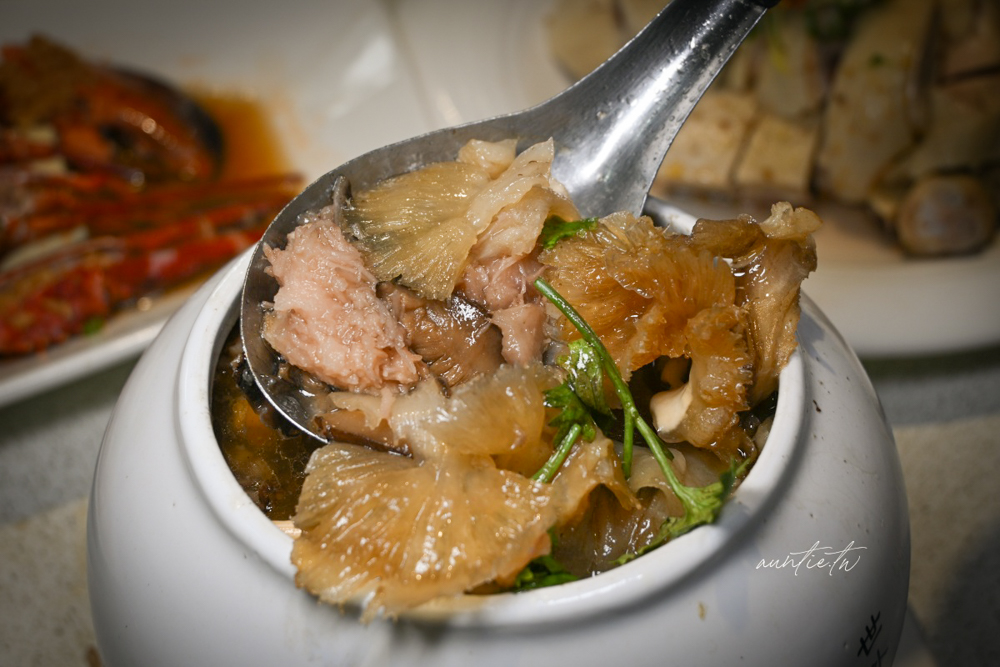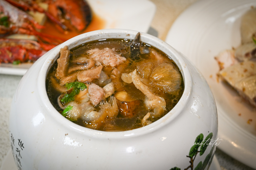 配料超豐富的魚翅佛跳牆是尾牙或年節桌上都不能缺少的一道菜色,用大湯匙一撈配料多得數不清耶,跟哆啦a夢口袋一樣撈都撈不完,蹄筋、豬肚、銀杏、排骨、豬腳、干貝、栗子、香菇、筍片……,湯頭甘甜一點都不油膩,非常好喝!