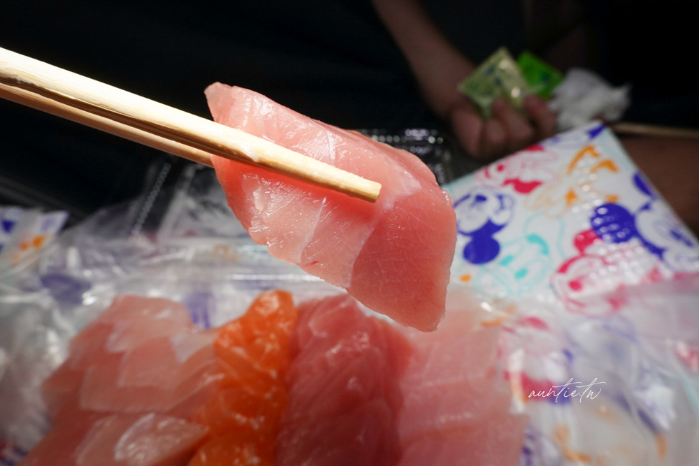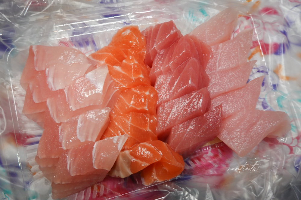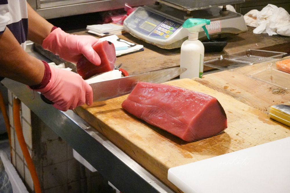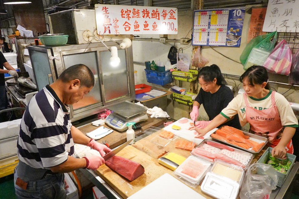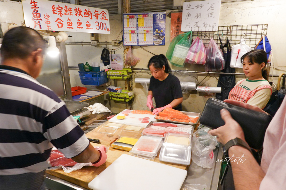 這次買的店家就是門口第一家,我也搞不清楚,就覺得門口地板乾乾的,味道也比較沒那麼重,賣的魚類有三種,鮭魚、鮪魚、旗魚,也可以單買一種魚類,一盒就是三百元。