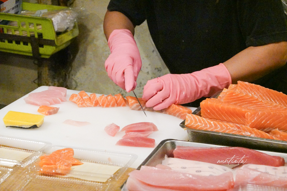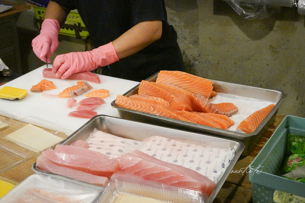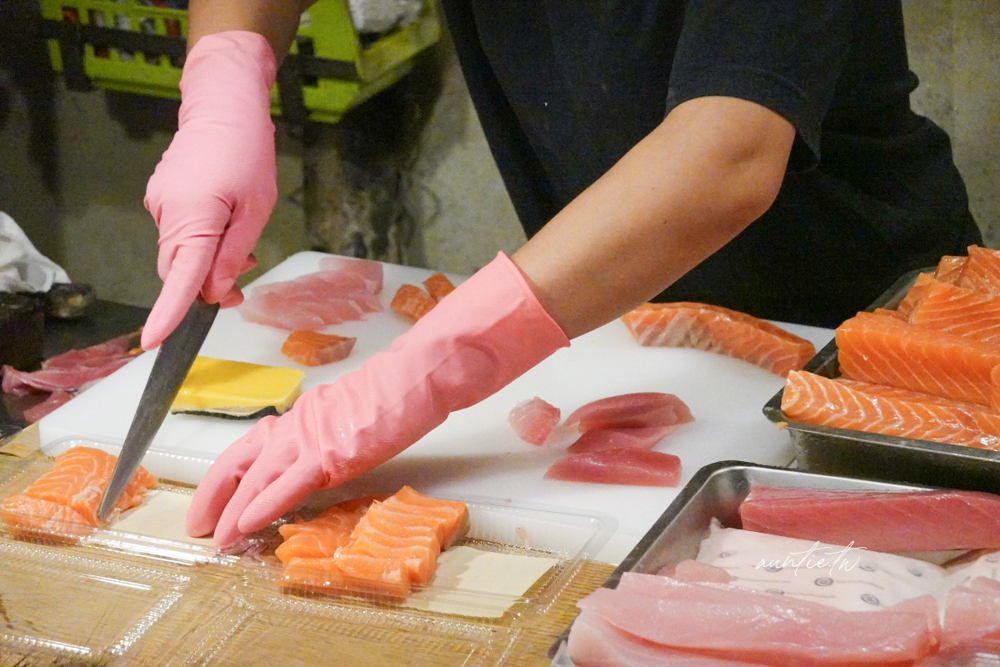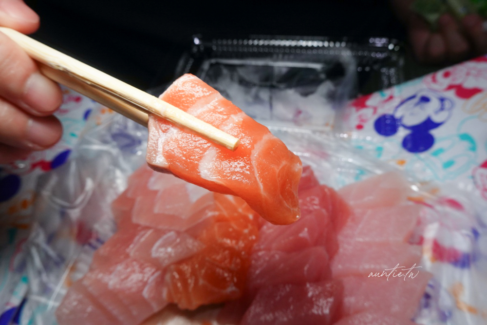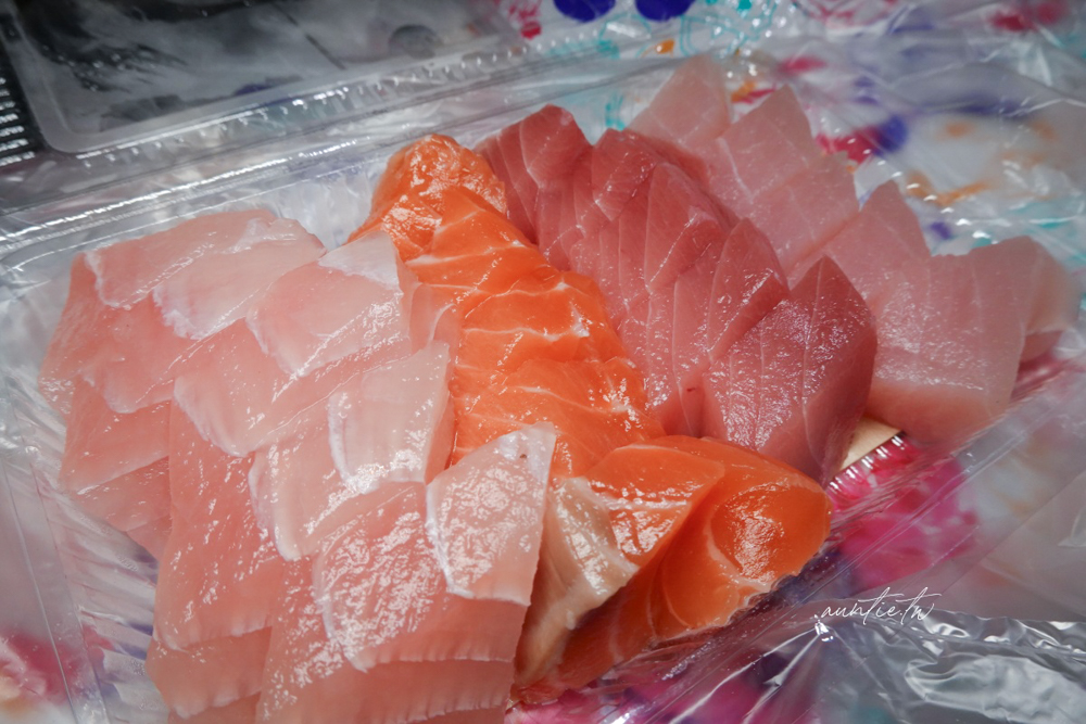 這次買的店家就是門口第一家,我也搞不清楚,就覺得門口地板乾乾的,味道也比較沒那麼重,賣的魚類有三種,鮭魚、鮪魚、旗魚,也可以單買一種魚類,一盒就是三百元。