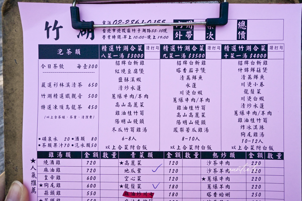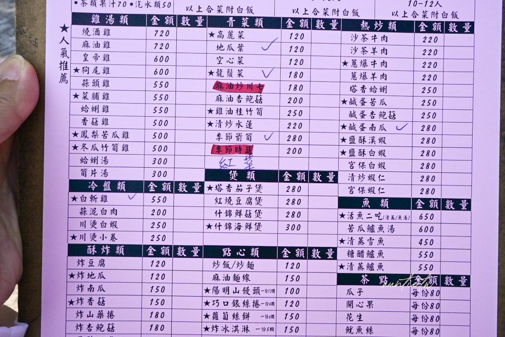 餐點品項不少,土雞必點,還有一些野菜是店家自種的,服務人員介紹時會特別推薦,菜名前有星號的都是推薦菜色,這次用餐人數不多,就點了幾樣試試味道,主要是想吃看看他們家的白斬雞味道如何。