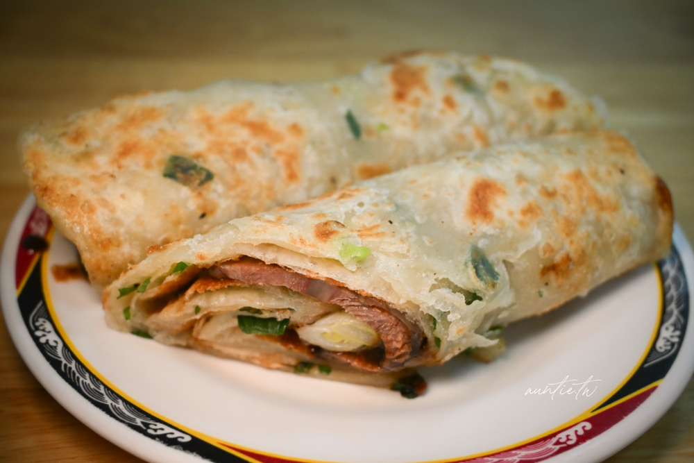 捲餅裡還包了蔥段在裡頭,搭配上甜麵醬、牛腱肉,用煎的香酥的餅皮包在一起,吃起來非常對味,口感味道都很棒。