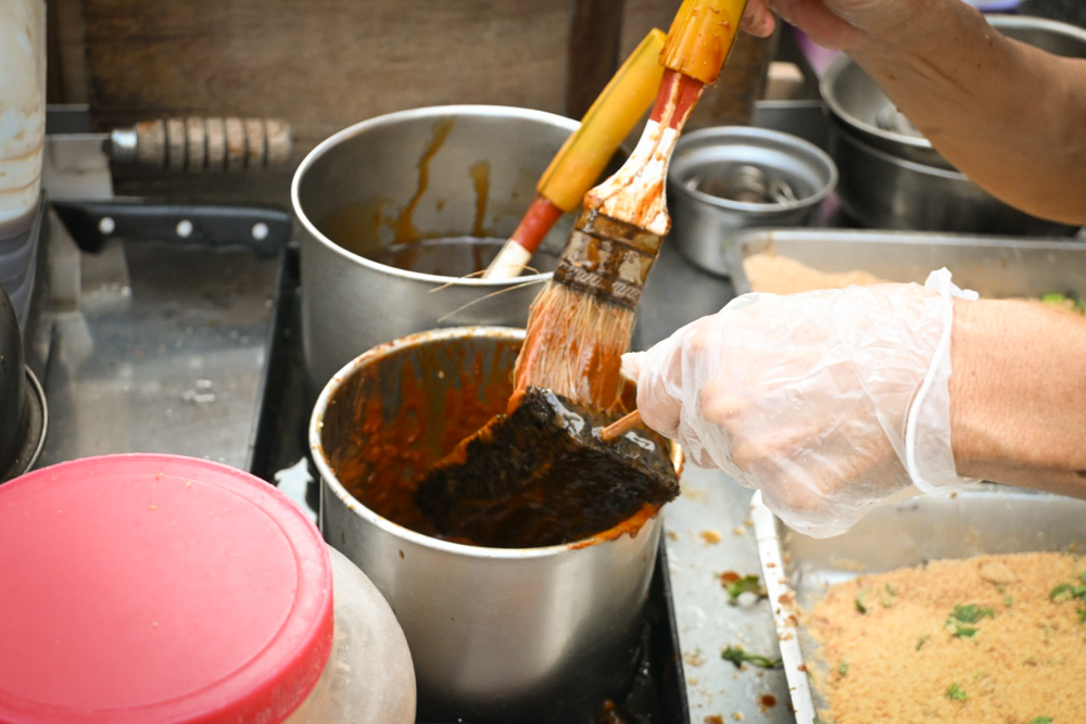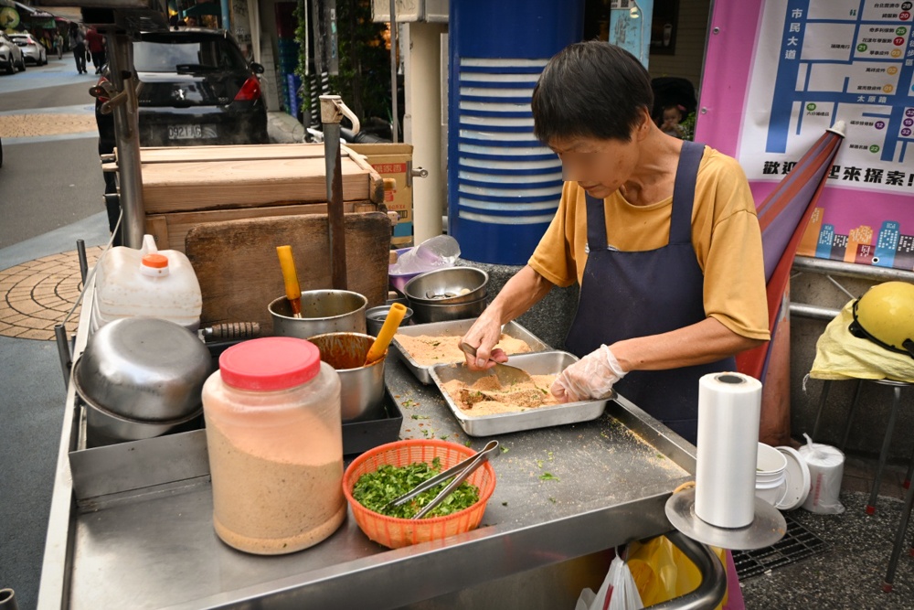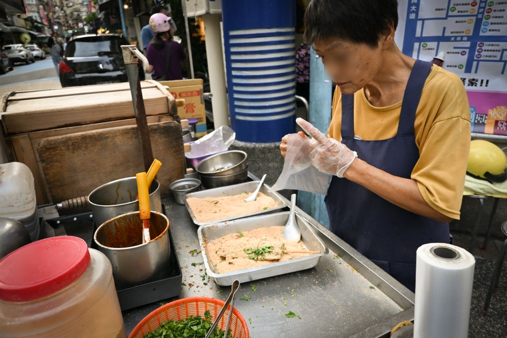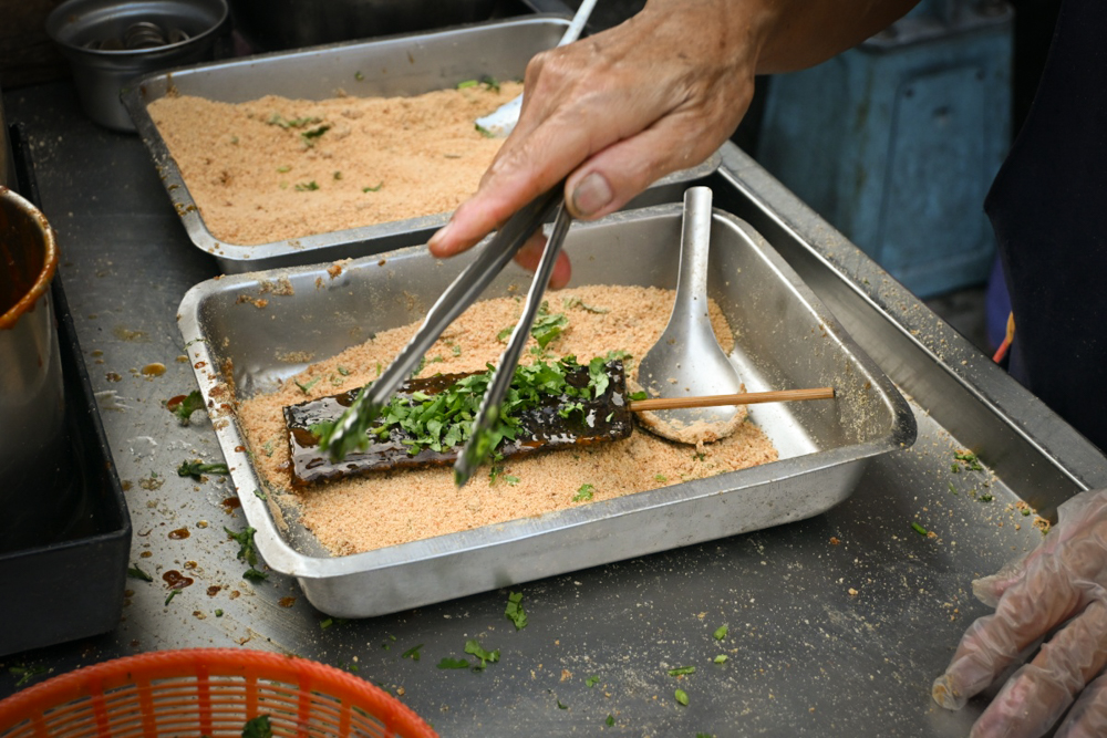 點了大份豬血糕真的還蠻大支的,35元這種份量算是很便宜,點餐之後阿嬤從蒸籠裡拿出豬血糕,刷上醬汁再裹上滿滿花生粉跟香菜,花生粉很細緻,花生香氣濃郁,香菜也給的蠻大器的。