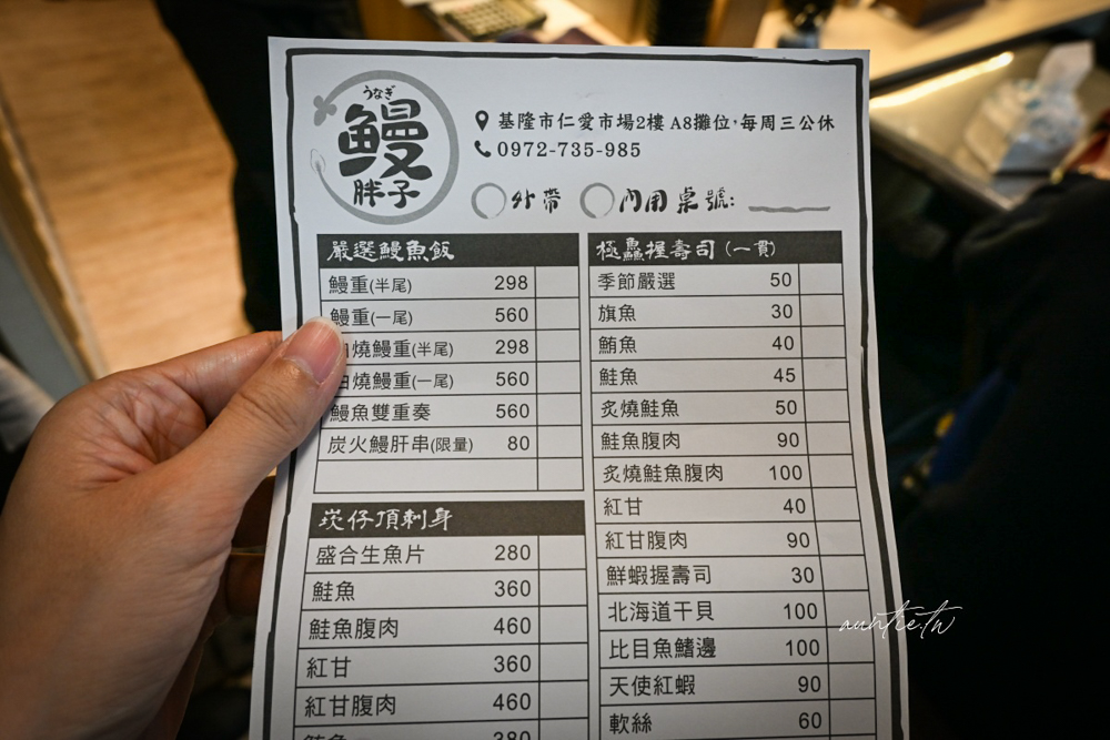 「鰻胖子」就在仁愛市場二樓A8攤位,最近市場地下停車場維修中有點麻煩,還把車停到東岸停車場,基隆最近不少地方在修路,大家要注意一下可能要繞路。本來沒有要吃這家鰻魚飯的,不過剛好店門口有工作人員在介紹,看到價格非常平價,而且是現烤的鰻魚,想說好久沒在台灣吃鰻魚飯了,嚐嚐鮮吧反正那麼便宜!