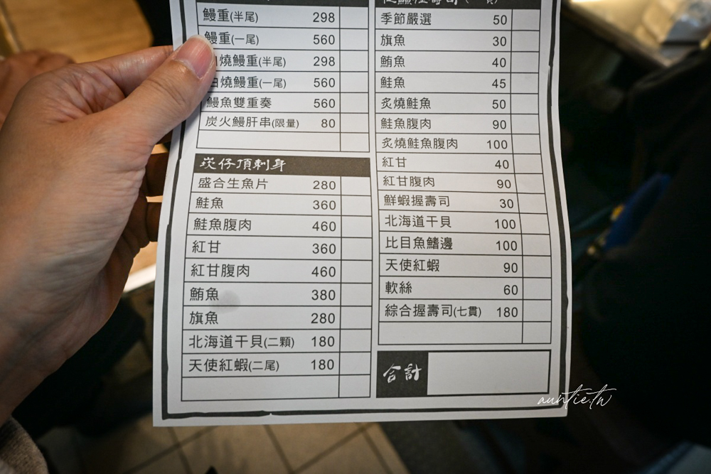 除了鰻魚飯還有生魚片、握壽司,種類還蠻多的。鰻魚飯的口味有沾醬的蒲燒以及原味白燒,半尾價格298元,整尾560元,價格算是非常便宜,不過份量也不多,解解饞可以。