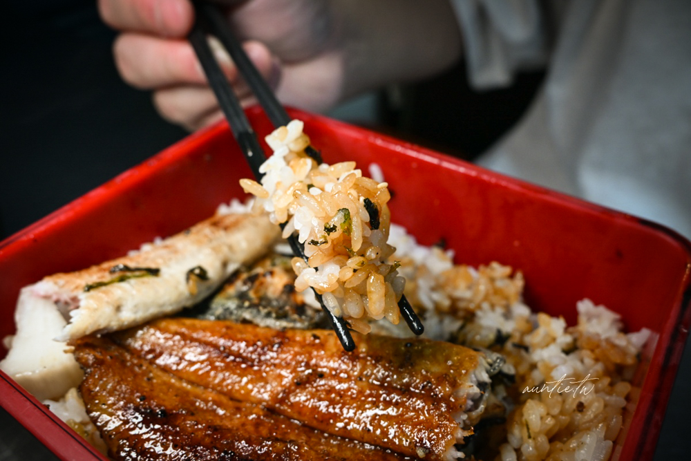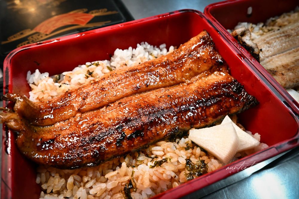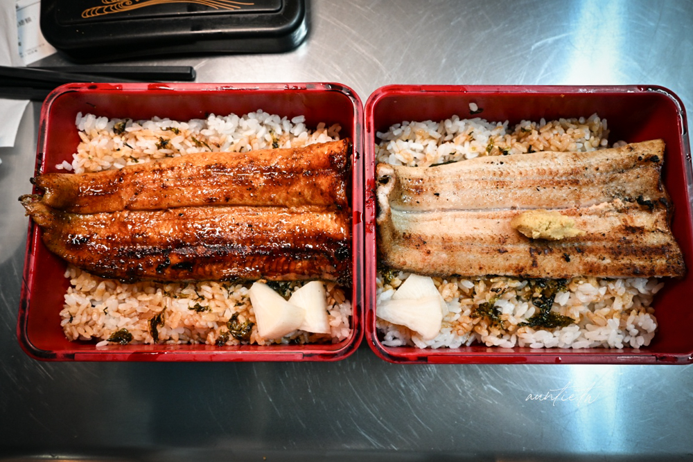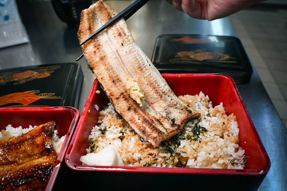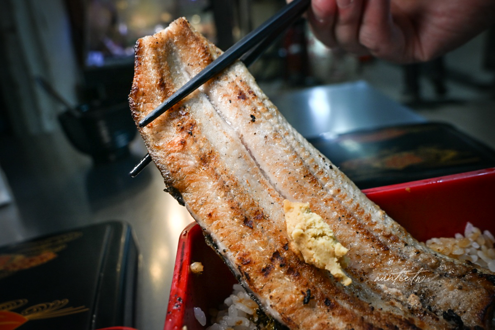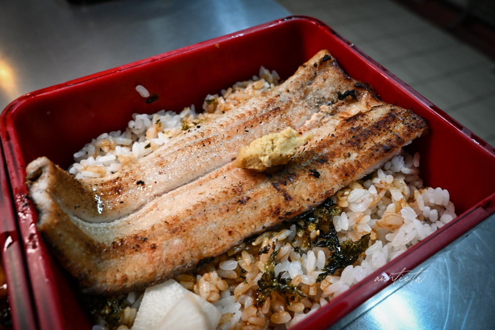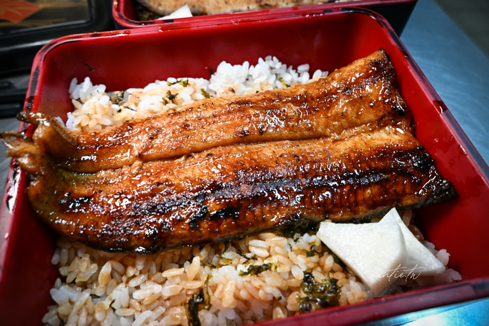 跟日本一樣用類似的漆器盒承裝,桌上有七味粉以及山椒粉可以灑在鰻魚上吃,該有的都沒少。蒲燒鰻魚的醬汁甜甜鹹鹹的,淋在白飯上的醬汁不多,吃起來會偏乾一些,不過飯上還有加了一點海苔提味,整體來說很下飯。