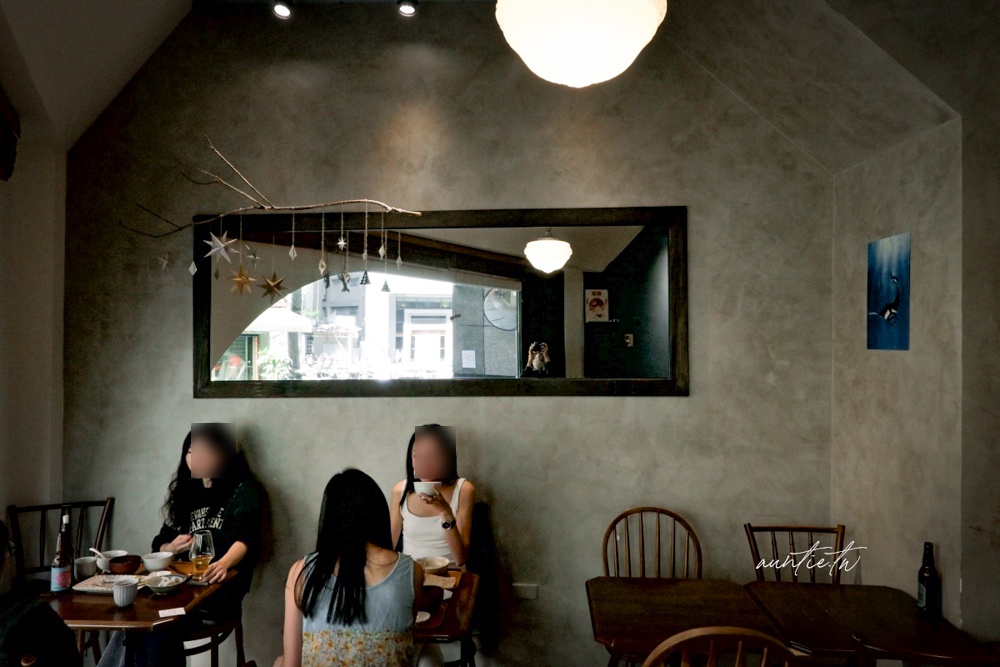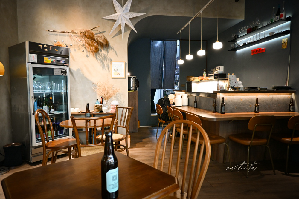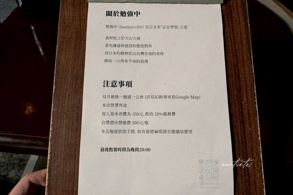 「勉強中 日式海鮮手作料理」位於古亭二號出口附近,出站一下子就到。從外觀看起來真的很像咖啡廳,木質的桌子,還有一個小小的吧台,大片落地窗採光很好,不過店內沒有廁所,想要上洗手間的可以去捷運站先上一下。看了一下他們的IG,餐廳也提供包場服務,低消2萬2千元,可容納10~24人,因為店裡也有提供酒水,小團體來聚餐也很適合。