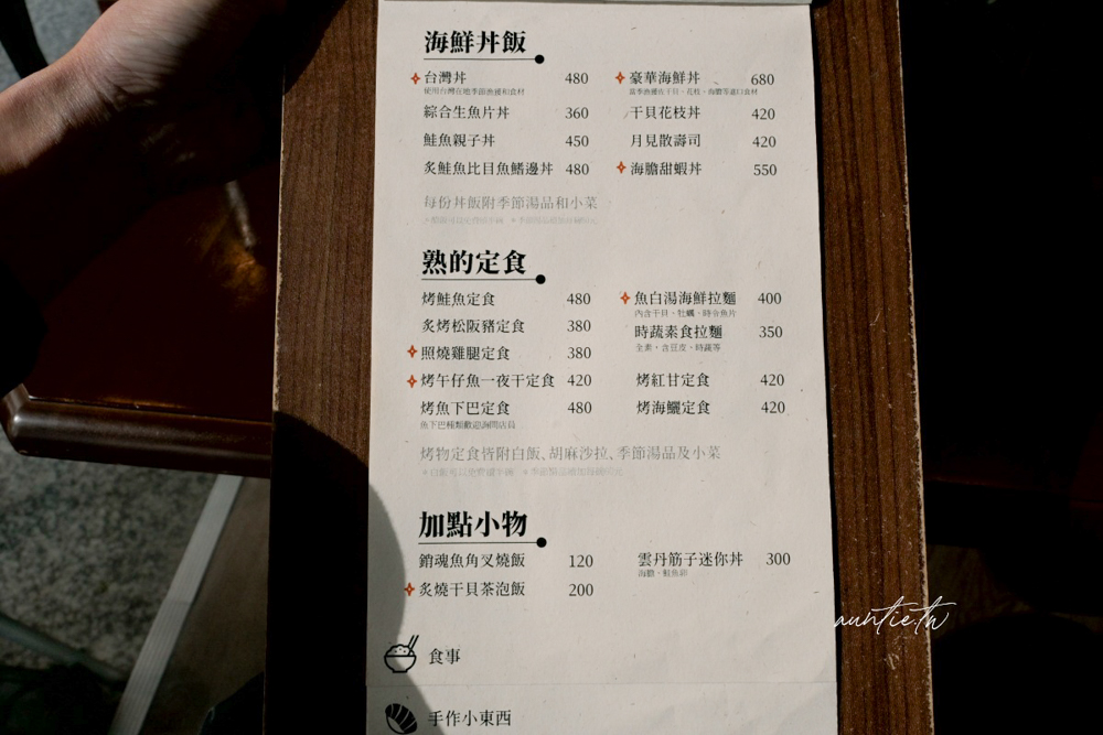 採自助點餐,可以掃桌上QR Code點餐,餐後再到櫃檯結帳,來這裡主要想吃海鮮丼飯,其實菜單上還有握壽司生魚片、烤物、小菜以及甜點,有看到隔壁客人點的冰淇淋,用玻璃高腳杯裝著看起來也很精緻。還有一些限量供應的餐點寫在門口的小板板上。每人基本消費350元,