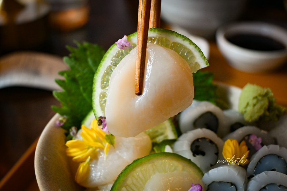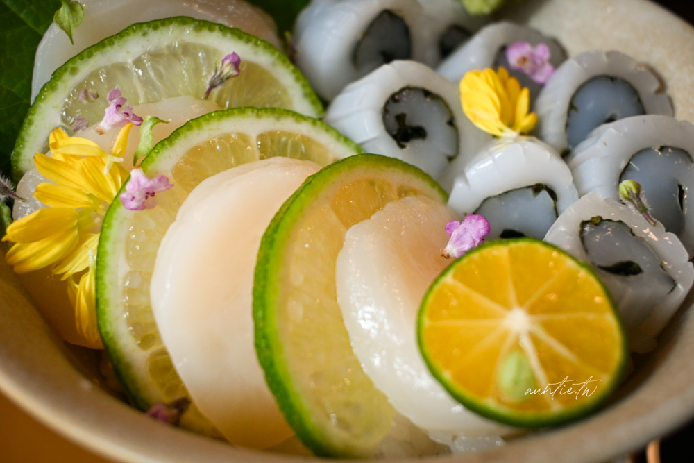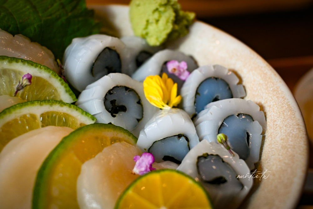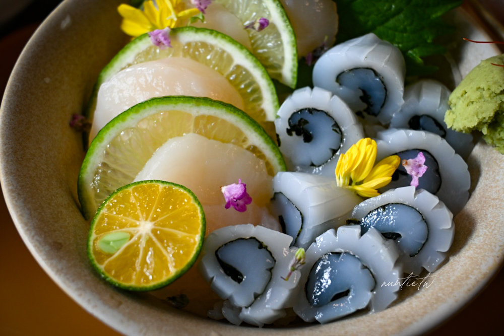 干貝夾著檸檬切片,花枝中間還捲著海苔片,除此之外還灑上食用花點綴,看起來非常精緻,食慾都來了!干貝的味道也是十分鮮甜,花枝QQ的口感加上海苔的加持更增添了海味。