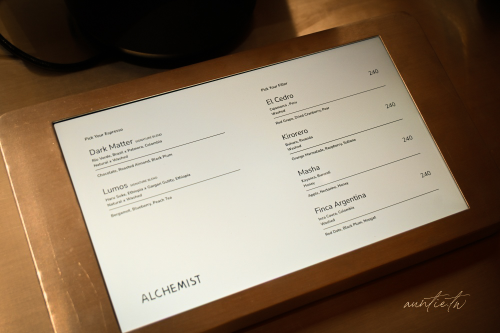 店內的菜單都是英文的,平板上是手沖咖啡,牆上則是義式咖啡品項,主要分為black and white ,也可以換成燕麥奶,義式咖啡可以選擇咖啡豆種類,堅果風味或是花香風味。