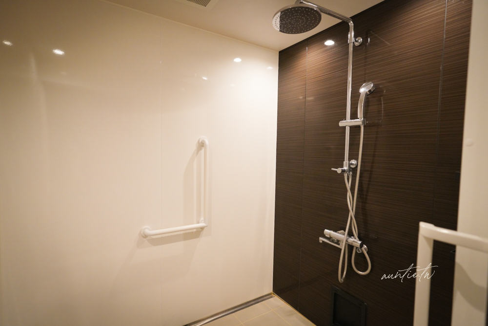 房間是無障礙空間,就算是坐輪椅也能輕鬆進出,門口、浴室都有設置斜坡。桌上有迎賓小點心,也有提供飲用水可以直接煮水泡茶。
