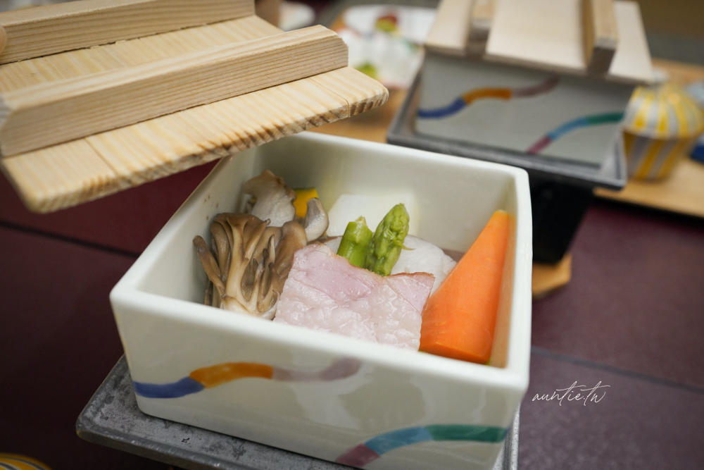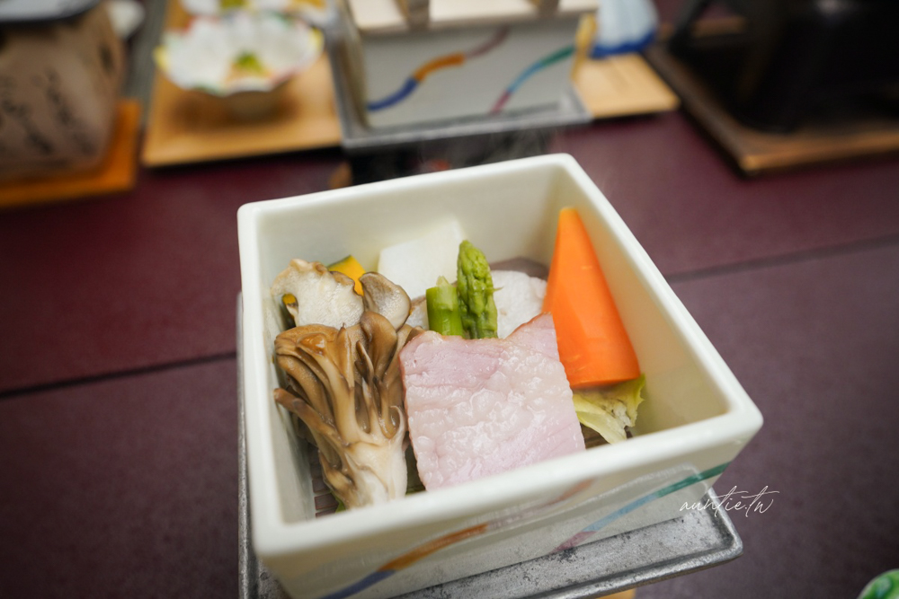 這次在飯店內享用了早餐跟晚餐,餐點美味精緻,食材都是使用伊豆產的當季山珍海味,早餐可以吃到砂鍋煮的白飯以及溫泉水蒸煮的蔬菜、現烤烤魚;