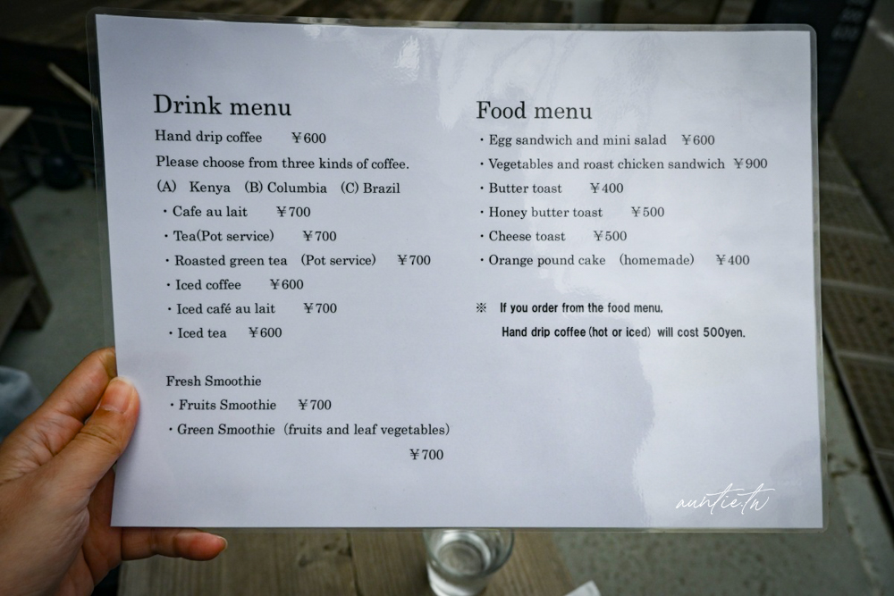 有提供英文菜單,有手沖咖啡也有義式咖啡、新鮮果昔,也有提供輕食三明治還有磅蛋糕,如果有輕食甜點的話,點手沖咖啡只要五百日幣,蠻划算的。