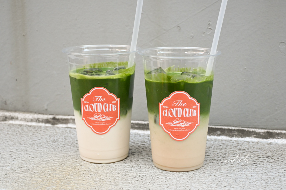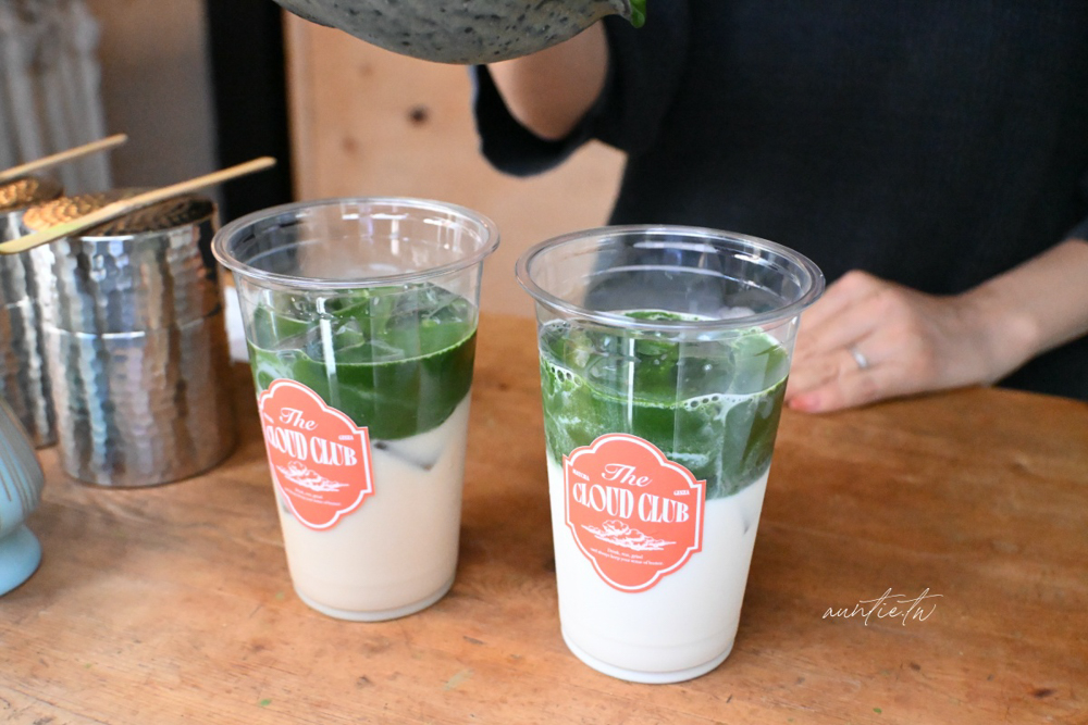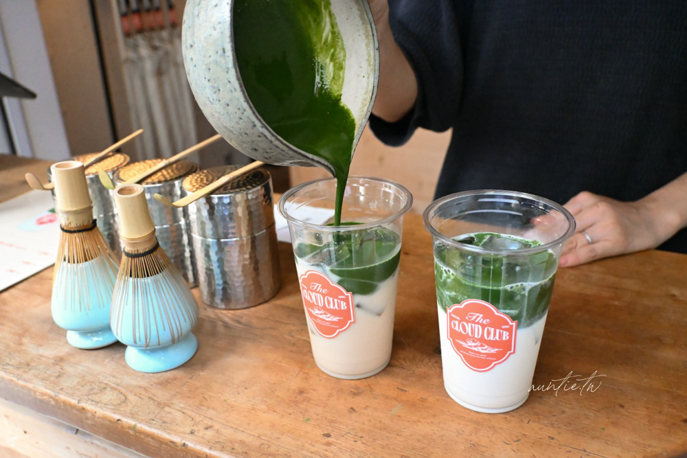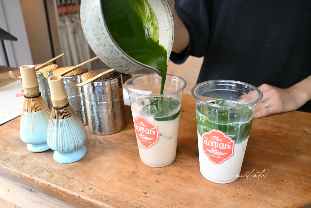 「Cloud Club Matcha」的店面小小,水泥磚牆非常簡約,前方的工作人員負責點餐、用竹筅現刷抹茶,後方的工作人員則是用牛奶或是燕麥奶調製飲品。