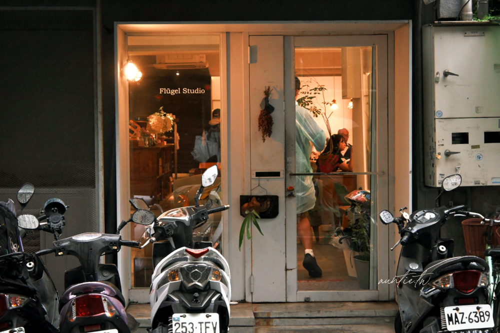 「Flügel Studio」距離台電大樓捷運站很近,從二號出口出來最近,步行大約五分鐘內就到,「Flügel Studio」的門口小小,一不小心就走過頭,內部空間倒是挺大的,颱風接近前的雨天店裡還是接近快客滿的狀態,店裡座位還蠻多,有大桌可能需要跟其他客人併桌,但是店員會擺上隔板不用太擔心。