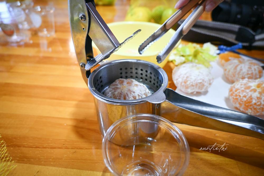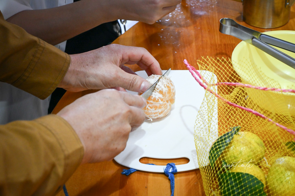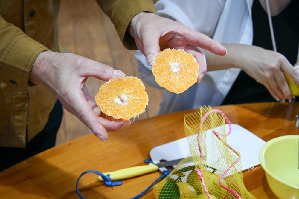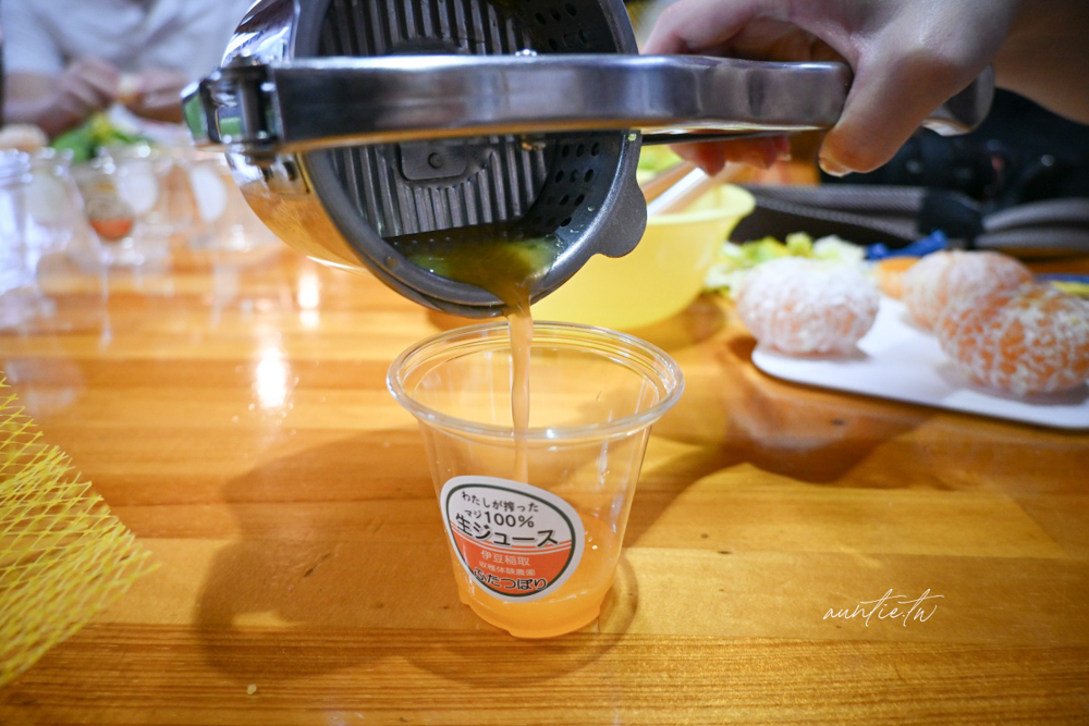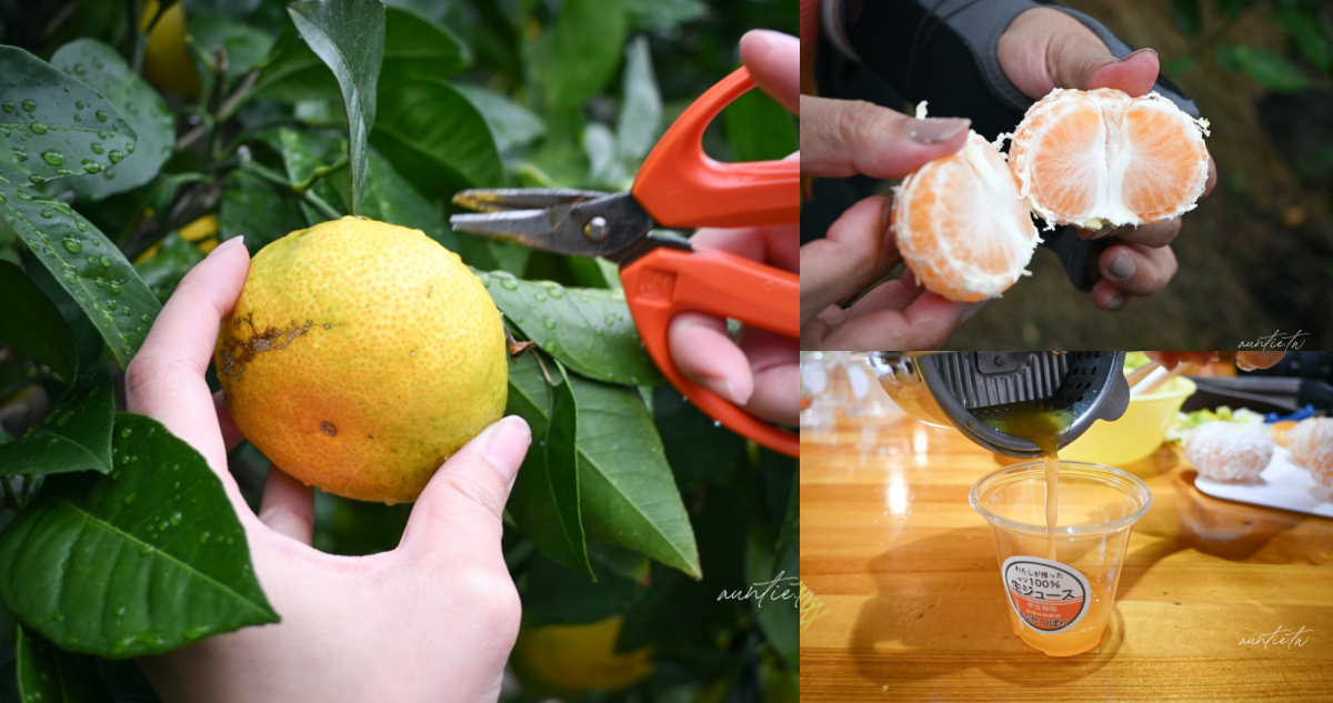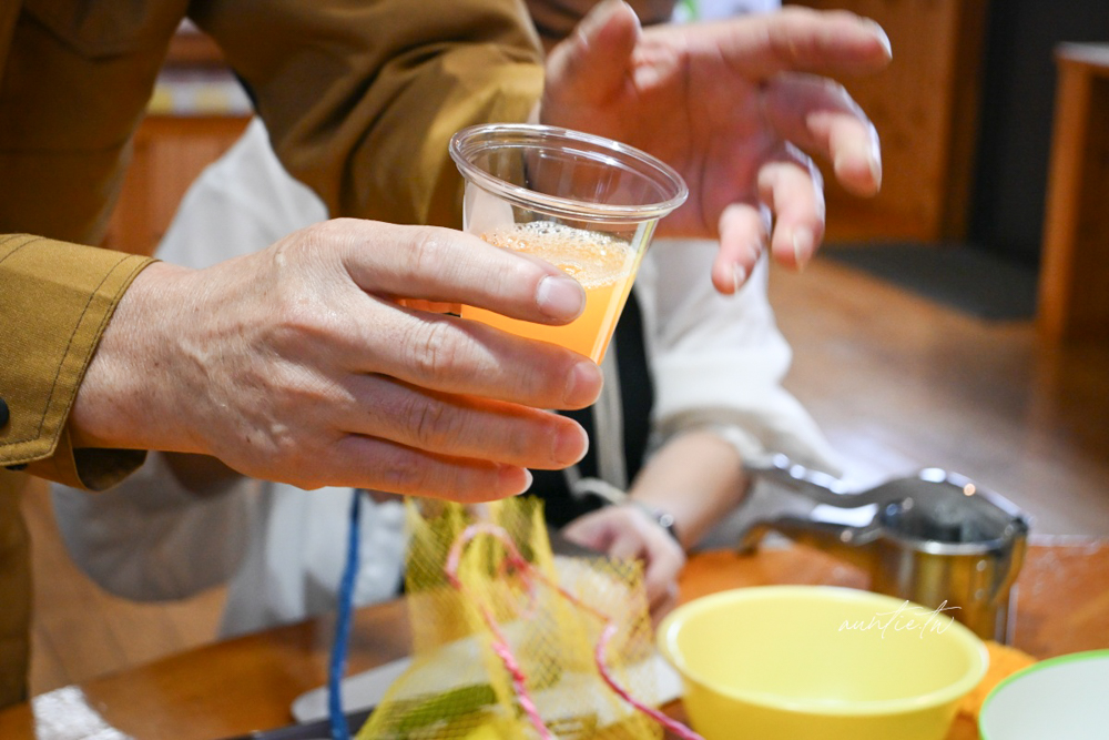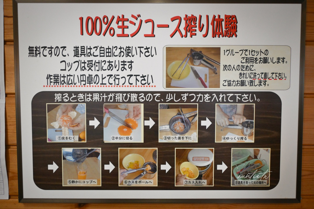 採收後的橘子還可以自己榨果汁喝,休憩處有提供榨汁機免費取用,使用過後需要自行清洗歸還。橘子切半後直接壓榨,喝起來鮮甜無比,現榨現喝,味道真的不是一般罐裝橘子汁可以相比的。
