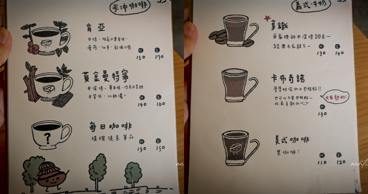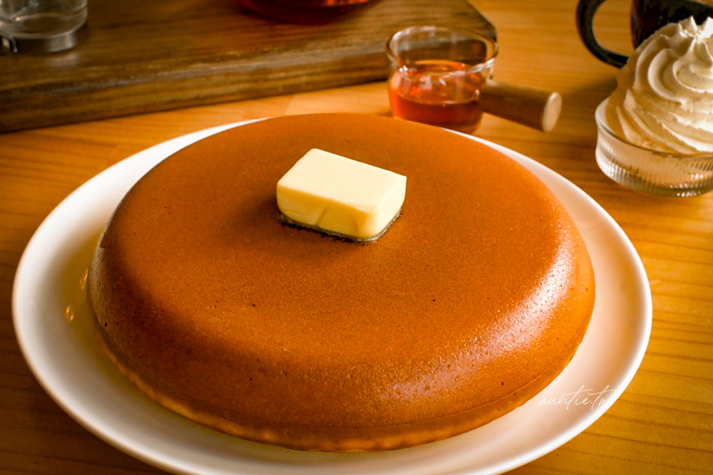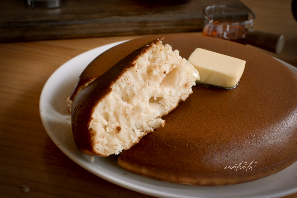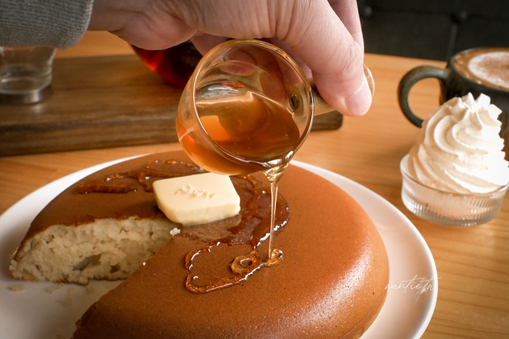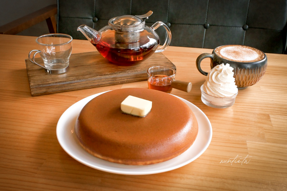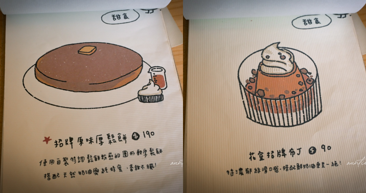 菜單頁數實在很多,後面有些就沒放了,不過大部分人常喝的義式、手沖通通有,也有茶飲類,選擇很多。甜點部分有鬆餅以及布丁,也有鹹食薄餅以及咖喱飯喔,想吃飽或吃巧都可以。厚鬆餅則有原味、紅豆、焙茶黑糖、棕起司,第一次來就點試試原味試試味道。