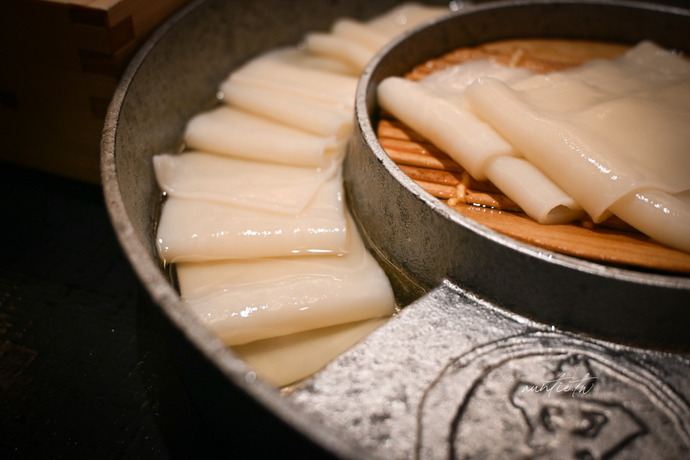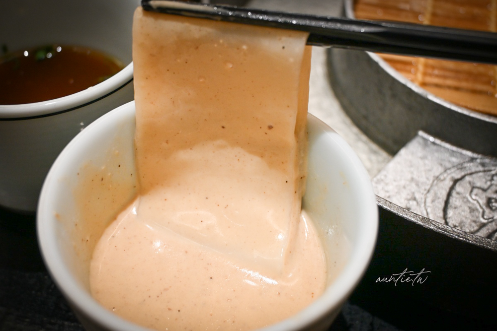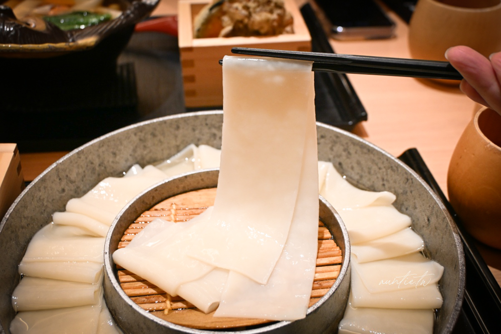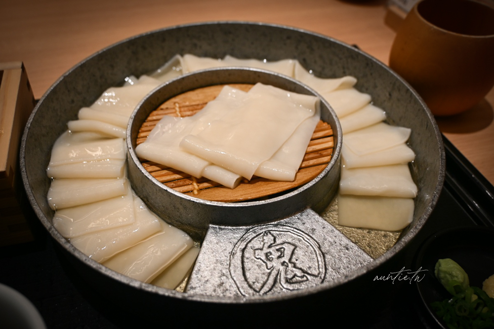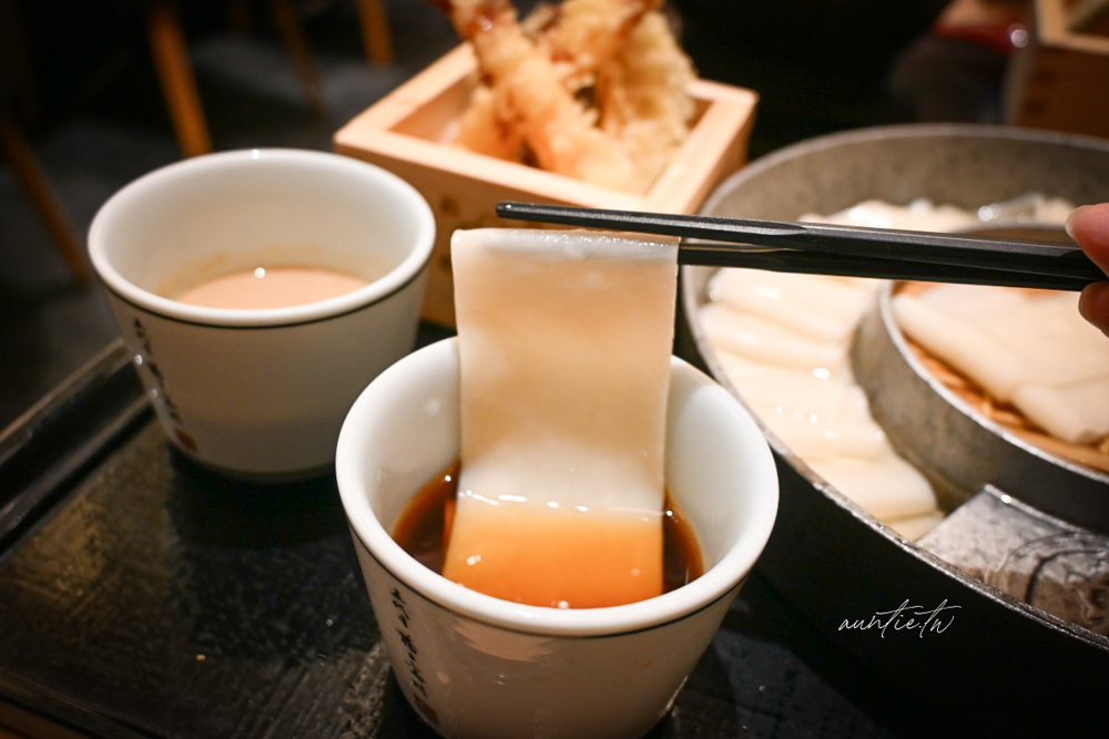 冷的烏龍麵可以沾著胡麻醬以及醬油兩款醬料一起吃,冷的鬼ひも川烏龍麵口感實在是Q彈到不行,感覺隨時會從嘴裡溜走一樣,連用筷子夾起來都超咕溜,吃起嘴裡的口感更是滑順彈牙到不行,兩款醬料中個人偏愛胡麻醬多一點,芝麻香味香醇不膩口,醬油口味是柴魚味較重,吃起來比較沒有驚喜感。