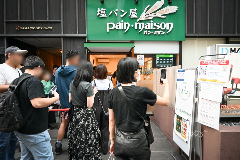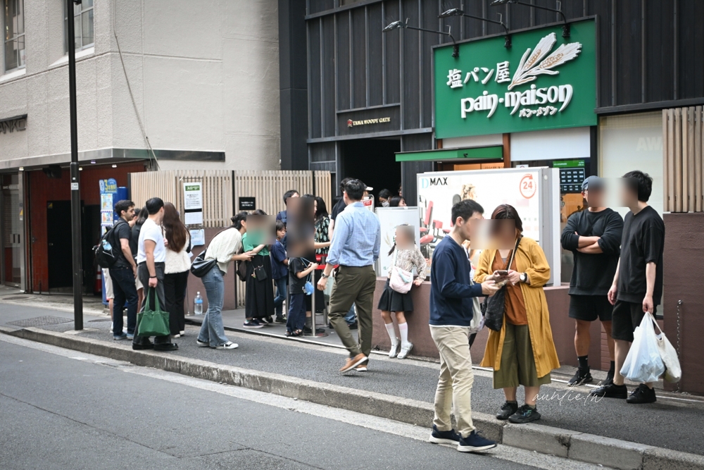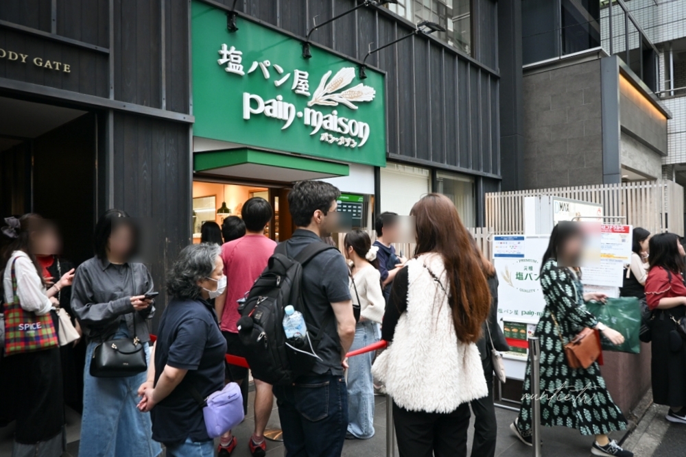 「塩麵包屋 pain・maison」目前只有在東京有店,三間店分別在吾妻橋、新宿以及銀座,只有銀座店可以線上先拿號碼牌,這次去的就是銀座店,距離東銀座站比較近,遠遠的就看到門口有人潮,要排隊的話需要掃門口的QR Code拿號碼牌,等到號碼叫到時再入列排隊,等候的時間也不能亂站,像是對面的大樓就禁止站立,會被保全趕到其他地方就是了。
