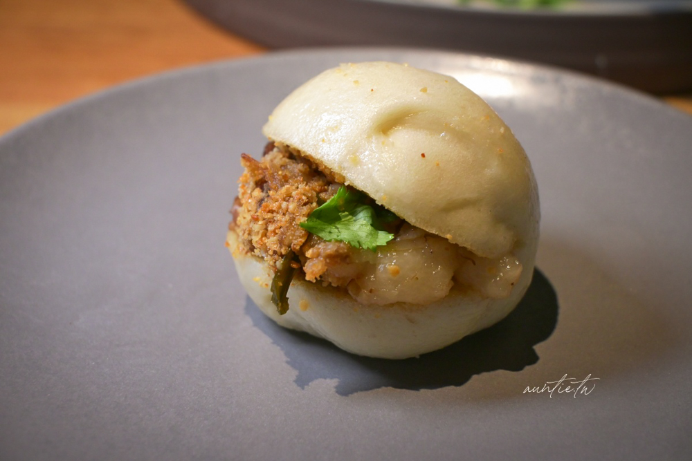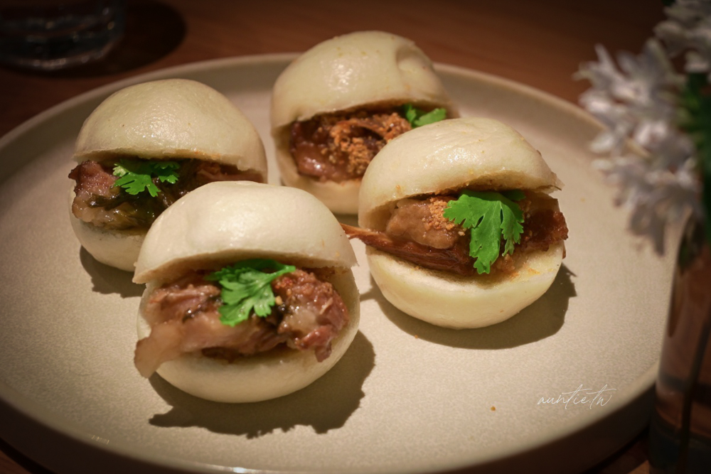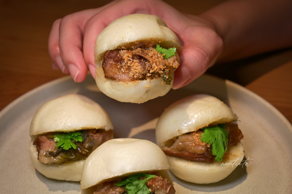 迷你小巧的台式掛包,很台的刈包突然變得超精緻有點不習慣,不過刈包該有的配料都沒少,五花肉、花生粉、香菜。五花肉的比例偏肥一些,不過這樣吃起來才不會太乾,刈包的外皮像個小饅頭一樣,比一般刈包的外皮咬起來口感有彈性,花生粉跟香菜增添香氣,整體來說是好吃的。