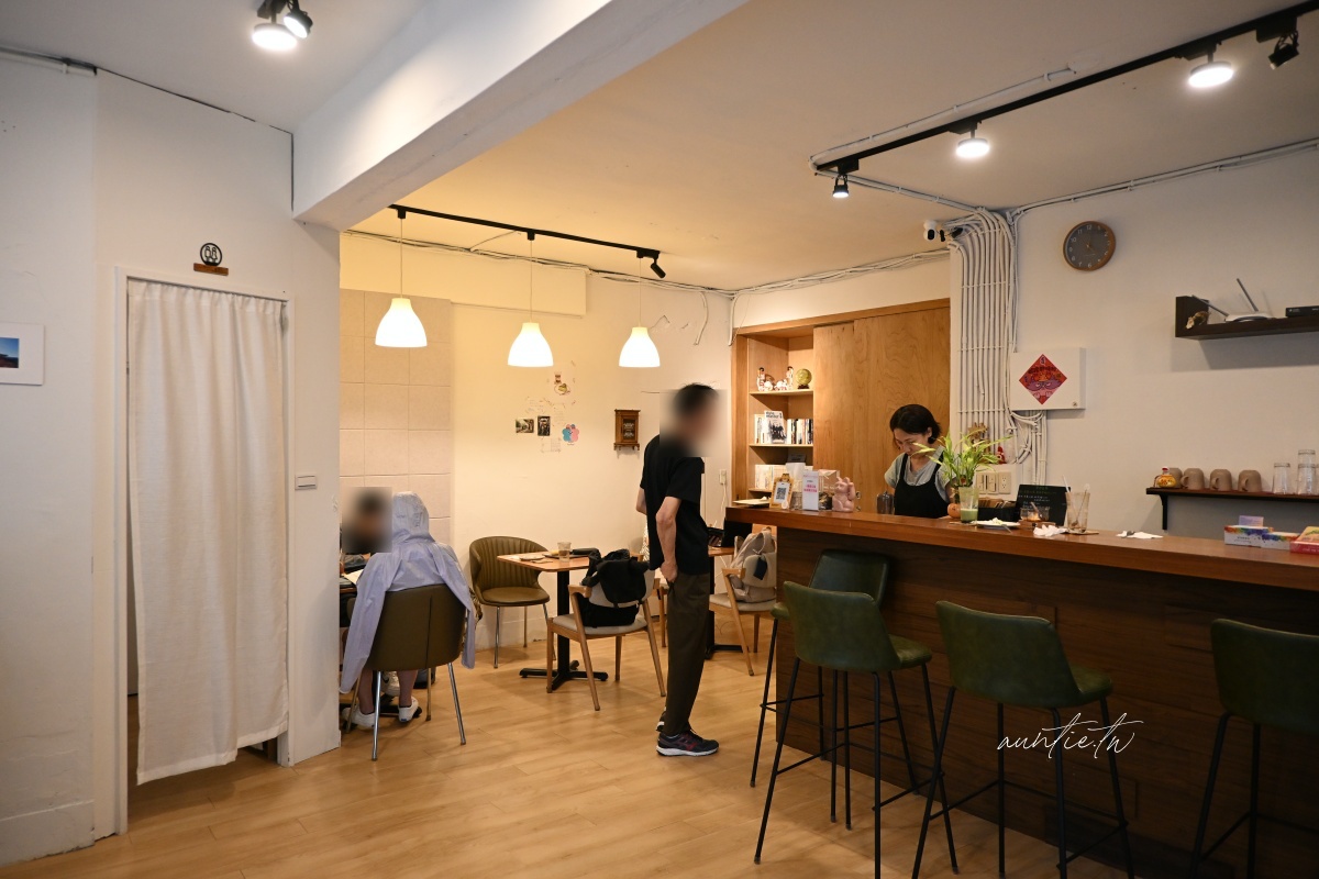 「杏枎珈琲」距離七張站大約五分鐘的路程,開車來的話附近市場有停車場不過車位不多價格又比較高一點,「杏枎珈琲」的環境走的是木質裝潢,感覺起來溫暖又溫馨,老闆娘一人作業,感覺不少客人都是熟門熟路的常客。座位有吧台椅及一般座位區,這次被安排在吧檯,還好高腳椅子不會太難坐。
